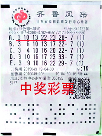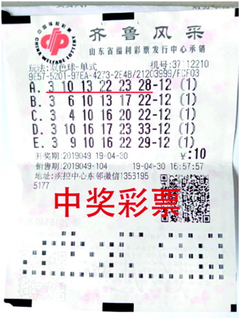 4月30日,双色球第2019049期开出中奖号码为红号3、10、13、22、23、28,蓝号15。日照市莒县37112210号销售场所喜获双色球二等奖2注。
