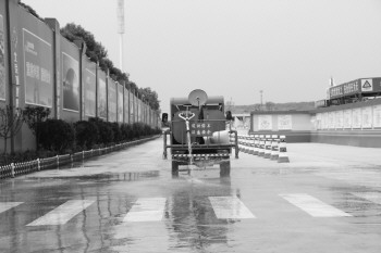 洒水车定时对工地内施工道路进行喷洒。 本报见习记者 王飞 摄