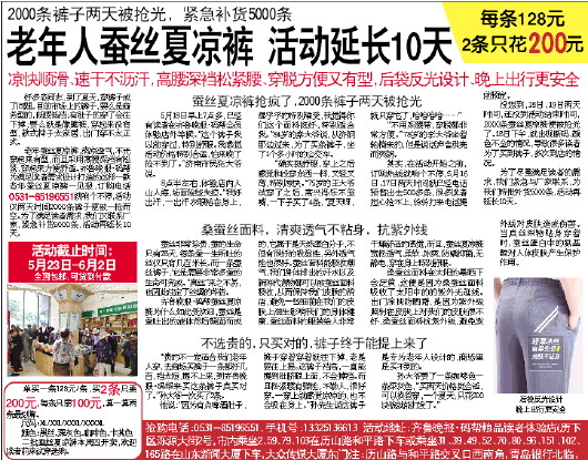 老年蚕丝夏凉裤,清凉透气,不光穿起来有型,而且采用高腰深裆有松紧,穿起来方便舒适。齐鲁晚报·码帮为满足读者需求设计打造的这样一款老年蚕丝夏凉裤一见报,订购电话0531-85196551就响个不停,活动仅两天时间2000条裤子便被一抢而空。为了满足读者需求,我们又联系厂家,紧急补货5000条,活动再延长10天。