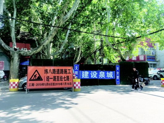 5月21日下午,记者探访了正在施工的纬八路。纬八路与经五路交叉口施工牌显示,纬八路道路(经一路至经七路)施工工期从2019年5月6日至2019年7月16日。目前封闭的区域为经五路至经一路,经五路至经七路尚未封闭,但是路两侧已经放上了建筑材料,也有工人正在刨掘路面。