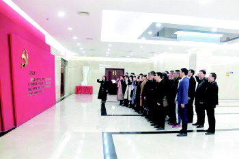 ▲图为区实验中学党支部全体党员在“廉洁文登·昆嵛清风”馆重温入党誓词。