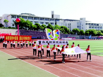 5月23日上午,“青岛科大杯”2019年青岛高校田径运动会在青岛科技大学开幕。开幕式上,裁判员和运动员代表宣誓,青科大学生进行了精彩的千人大型团体操表演。22日—24日,23所驻青高校的485名学生将参加36个项目的竞技比赛。