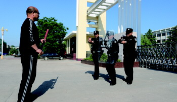 保安防暴演练 为有效防范校园暴力事件,提高校园保安面对突发暴恐事件应急处置能力,近日,沂源三中开展了保安应急防暴实战演练活动。 (江秀德)