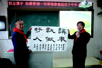 据泊于中学校长鲁世科介绍,李双举的善行对学生们的影响是深远的,他给学生们的是一种传递爱的精深,这种精神远远大于梦想基金的力量。为了表达学校师生的感情,鲁世科校长专门为李双举先生赠送了“讲奉献 做好人”的书法作品。