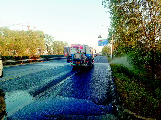 一体化管理降尘到位。为确保洒水清扫两者兼具,街道形成“洒水+清扫”的一体化降尘管理体系,联系洒水车通过高压喷水,实现道路表面浮土、颗粒的彻底冲洗,在洒水作业完成后,扫地车紧随其后,将冲洗到路面两侧的泥土、垃圾等清扫彻底,确保降尘到位、清洁到位。