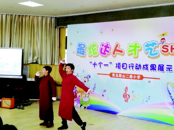 幽默风趣的相声表演、古朴典雅的管乐演奏、栩栩如生的绘画展示……5月29日,青岛鞍山二路小学开展最炫达人才艺show之“艺术才能堡”成果展。20多个节目经海选后展演,都是孩子们自编自导自演完成。在“六一”儿童节到来之际,学校还开展了百科创意书、音乐会客厅、诵读演讲台、星秀时光站等活动,为每一位同学搭建展示自我的平台。