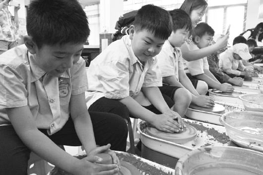济南市阳光100小学的学生学习制作陶器。 见习记者 王凯 摄