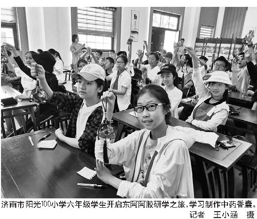 济南市阳光100小学六年级学生开启东阿阿胶研学之旅,学习制作中药香囊。 记者 王小涵 摄