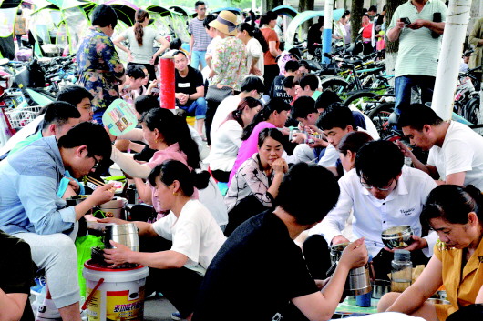 ◤下午放学时间很短,不少家长选择把饭送到学校门口。