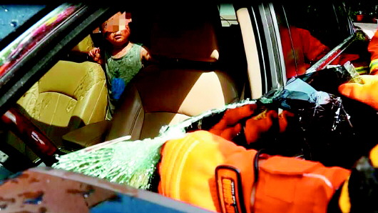 4日上午,骄阳似火,千佛山东路某居民院内,一市民让两岁孩子单独待在私家车内时,车辆突然自动落锁,钥匙也被锁车内。接到报警的济南消防开元山庄中队消防员迅速赶到现场救助。用锤子将驾驶室车窗玻璃砸开后,手能伸至车门内侧开锁。谁想,车门毫无反应,依然无法打开。只好由一名身材瘦小的消防员钻窗入车,找到钥匙才打开车门救出孩子。对此,消防员提醒:炎炎夏日,千万不要把孩子单独留在车里,以免悲剧发生。(视频截图) 齐鲁晚报·齐鲁壹点记者 尉伟