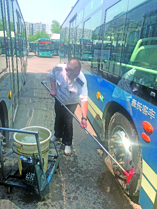 上午8点多,当记者来到位于南部山区的88路公交车队时,孙荣峰已经从仲宫到市区青年西路来回跑了一趟了。回到车队的他顾不上吃早饭,正忙着接水,准备擦拭驾驶员区域和轮胎。
