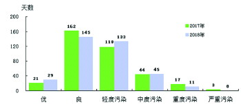 滨州市城区(以省控以上监测点统计)空气质量良好天数174天(其中:优29天),占总天数的47.7%,比上年减少9天(主要是由臭氧和二氧化氮引起的污染天数增加所致);轻度污染133天,比上年增加15天;中度污染45天,比上年增加1天;重度污染以上11天,比上年减少9天。其中以国控监测点统计良好天数为172天,比上年减少13天。