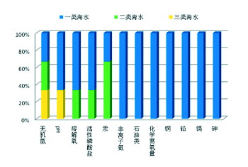 各监测指标按监测次数计算,非离子氨、石油类、化学需氧量、铜、铅、镉和砷全部符合一类海水标准;无机氮一类、二类、三类海水比例各占33.3%;溶解氧与活性磷酸盐一类海水比例均占66.7%,二类海水比例均占33.3%;pH值一类海水比例占66.7%,三类海水比例占33.3%;汞一类海水比例占33.3%,二类海水比例占66.7%。