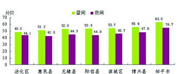 区域声环境质量夜间平均等效声级范围在42.8~54.7分贝之间,其中惠民县、阳信县、沾化区、无棣县平均等效声级分别为42.8、44.0、44.1、44.3分贝,区域声环境质量为二级。滨城区、博兴县平均等效声级为45.7、47.6分贝,区域声环境质量为三级。邹平市平均等效声级为54.7分贝,区域声环境质量为四级。