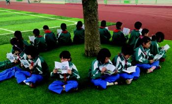 传承经典 为营造浓厚的书香校园氛围,传承国学文化经典,弘扬民族文化精髓,近日,沂源县中庄镇中心小学举行“古诗游园”活动。 (张芳 房秀坤)