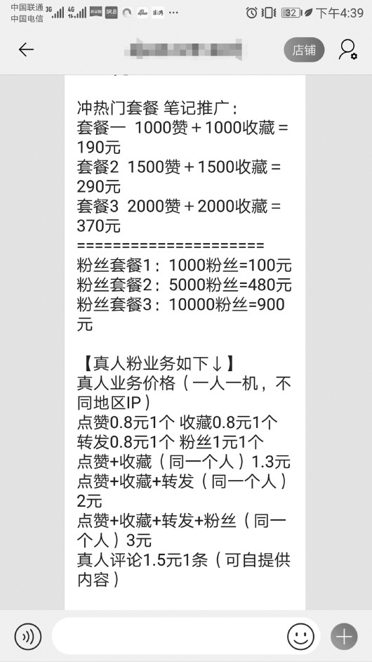 “机刷粉”业务中,高质量点赞100个、收藏100个、粉丝100个,价格均为10元。热门套餐中,2000赞+2000收藏为370元,10000粉丝为900元。而在“真人粉”业务(一人一机,不同地区IP)中,粉丝1元/个,点赞、收藏、转发均为8毛/个。真人评论1.5元/条,还有的商家给出视频价格为150元/1万播放量,25元/1000阅读量。