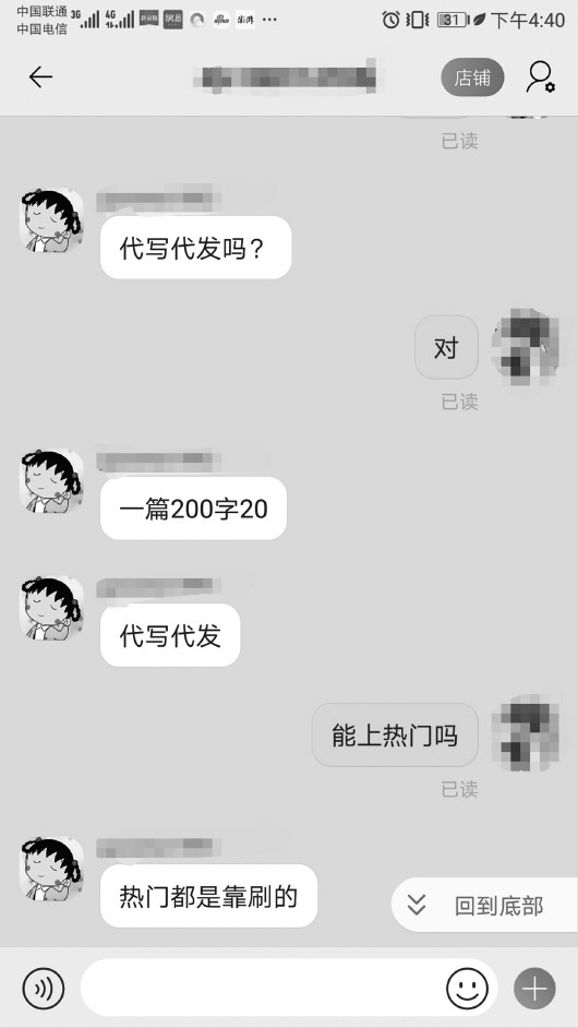在笔记代写业务中,有的网店要价为20元/200字,买家只需提供文案要求和图片,后期卖家还可以提供维护评论的服务。当记者咨询代写的笔记能否上热门时,客服回应“热门都是靠刷的”。