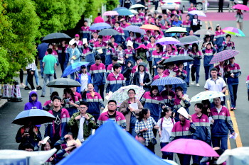 雨越下越大,考生们互相鼓励,互相打气,随之相互告别:“加油!好好考,哥们儿。”“考完了一起去玩,别忘了!”