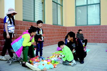 精心布置的摊位、引人注目的童话书、五彩斑斓的小发夹、毛茸茸的布偶等,各种各样的“商品”让人眼花缭乱。为了招揽顾客,大家更是使出了浑身解数,招牌、精美赠品、小喇叭等应有尽有。“快来看呀,玩具便宜卖了!”、“你这个玩具卖多钱?”孩子们有模有样的叫卖着,讨价还价声不绝于耳,现场热闹非凡。