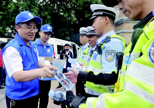 海洋环保志愿者为交警送上“甜海水”。齐鲁晚报·齐鲁壹点记者 王媛 摄