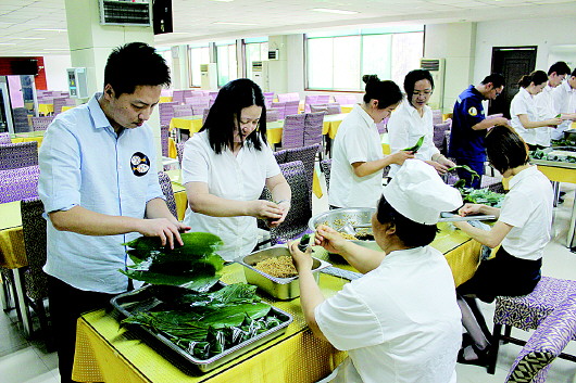 山航综合保障部40余名员工利用一下午的时间包出了1500多个粽子,有原味、红枣、蜜枣、红糖四种口味。这1500多个粽子在6月6日午餐时间与6月7日早餐时间为全体员工免费发放。 (高才升 朱桂玉)