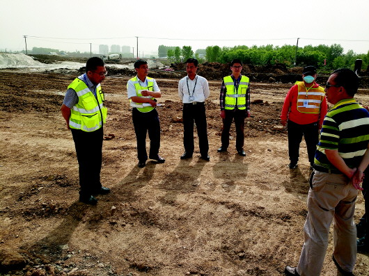 王方茂在施工现场(左起第一位)。