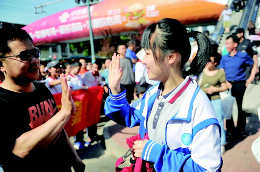 省实验中学考点,家长击掌、亲吻送别考生,带着亲人的祝福考生走进考场。 齐鲁晚报·齐鲁壹点记者 王媛 摄