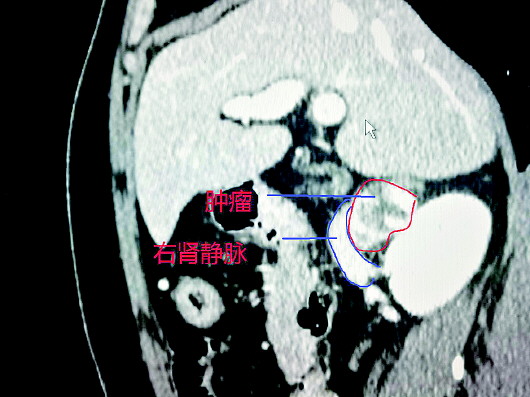 另外,肿瘤被腹膜后各大血管团包绕,CT显示其位于下腔静脉后方并将这支腹腔最粗的静脉压瘪,其下方紧邻右肾静脉,后上方毗邻右肾动脉。肿瘤游离要绝对避免上述血管的损伤,可谓“刀尖上的舞蹈”,一旦手术开始就没有后路,只许成功不许失败,不容丝毫意外发生。