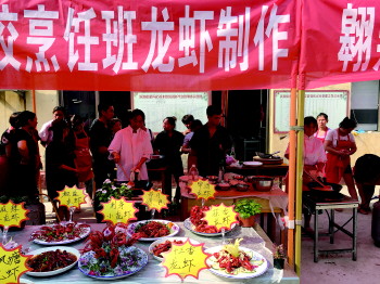 12日下午,鱼台县滨湖街道马石庄村,不时飘出一阵阵香味,这是学员们在练习炒小龙虾。啤酒小龙虾、避风塘小龙虾、蒜香小龙虾……在师傅的指导下,两名学员同时开火,依次倒入所需调味品,不一会儿,一盘盘鲜香诱人的小龙虾就端上了桌。