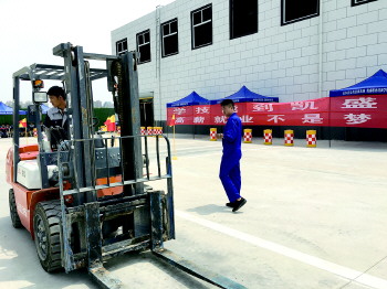 王维磊今年23岁,听说熟练的叉车工人月工资能达到五六千元,他赶紧报了名。在他练习的同时,实训基地培训场旁,众多学员身穿制服,认真听老师讲解叉车驾驶技巧。
