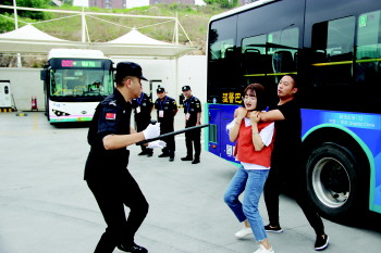 6月13日上午10点,一名“歹徒”携汽油上车欲纵火,败露后想挟持乘客。危急时刻,驾驶员引导车内乘客迅速撤离,几分钟后警车赶到现场,公安和消防部门集体制伏“歹徒”消除险情。这些模拟场景是交运温馨巴士顺达分公司联合中韩边防派出所、银川东路消防中队、青岛交通医院及温馨巴士迅达分公司进行的反恐消防演练。