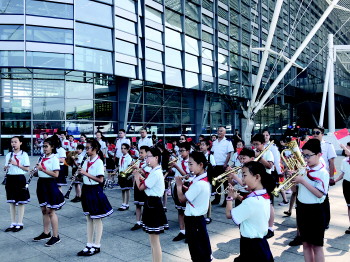 一句《我和我的祖国》悠扬的旋律,吸引了铁路北站来往乘客的注意,伴随着悠扬的歌声和响亮的器乐声,越来越多的群众加入到歌唱的行列中来。手持国旗公交车驾驶员与少先队员们相互簇拥着、手拉着手聚集到东广场中央,用音乐表达对祖国的祝福。