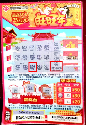 回到家后,女儿就迫不及待地刮起来,每刮完一张,女儿都会问孙女士“妈妈,这张有没有中奖啊?”当刮到第4张时,孙女士看到“我猜的号码”与“胜利号码”有一个是相同的,孙女士就意识到中奖了,只是令她想不到的是,数字29下面的奖金竟然是最高奖25万元。