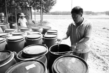 而在板房外面,也堆放着几十个密封桶。付双月说,这些密封桶里是用烂菜叶制成的酵素,“不同的蔬菜制成的酵素,功效还不同。”他解释说,像辣椒制成的酵素有杀蚜虫的功效,而白菜制成的酵素营养更丰富。