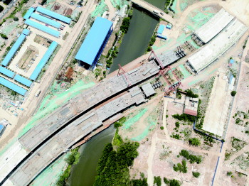 桥梁下部结构、主跨合龙拼接完成,道路工程正在进行灰土层施工……目前,备受瞩目的车站南路跨老运河桥梁工程项目最后一批钢箱梁加工已经接近尾声,正在进行防腐涂装。预计9月初完成桥面铺装及附属结构,9月中旬完成检测(荷载试验),竣工通车即在眼前。该项目完工后,将有效解决新老城区交通不便的问题,助推太白湖新区新发展。图为大桥鸟瞰图。