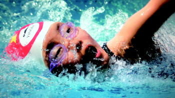 日照市金海岸小学四年级的王小硕说:“我刚游完了自由泳,一会儿还参加蛙泳比赛,我共有五项比赛项目。”
