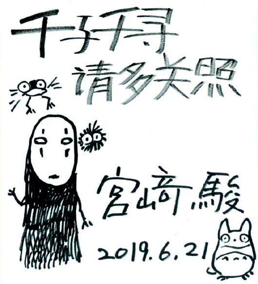 当天,宫崎骏导演因新片制作未能亲自到达现场,但他专门为中国观众准备了汉字手写信“千与千寻,请多关照”。这句话中文、日文写法完全不同,可见是宫崎骏为中国观众练习中文字用心准备的。此外,信上还有宫崎骏亲笔绘制的无脸男、龙猫等吉卜力动画代表角色。手写信一经发布,无数观众“哭成一片”,许多人表示“宫崎骏爷爷超级可爱的汉字和手绘是无比珍贵的礼物”。