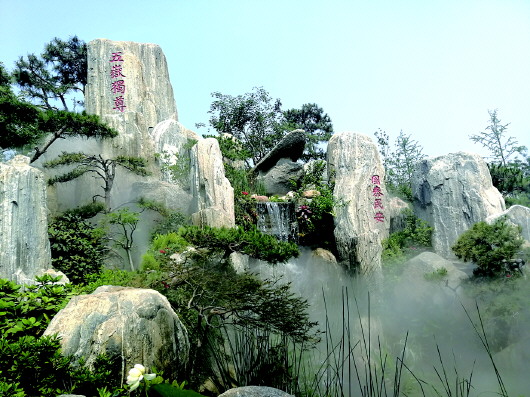 ▼室外展园“齐鲁园”中,雾喷技术营造泰山风光。