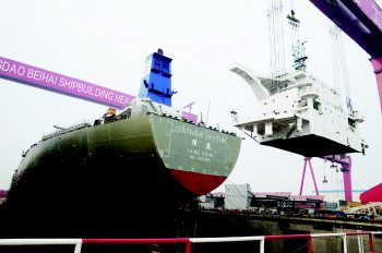 青岛北船重工造船基地正在进行船舶塔楼吊装。(资料片)
