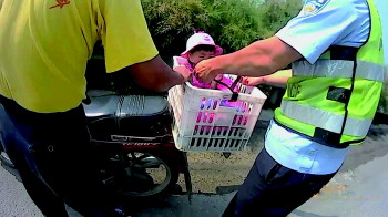 下车查看后,民警发现,塑料筐是敞口的,只用了一根普通绳子挡了一下坐在筐里的幼儿。经询问,民警得知老人是附近一村庄的村民,骑摩托要去田里干农活。因家里没有人看孩子,孩子太小又坐不了摩托车,老人就想出了这个办法。民警对老人进行了严厉的批评教育,随后将老人和孩子带到中队,并通知家属前来将两人接回。