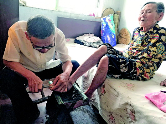 高建义给自己93岁的老母亲马春英修剪脚指甲。二十多年前,马春英老人经历老伴去世,又因脊椎受伤和双目失明,一直卧病在床。今年70岁的儿子高建义和儿媳左新兰几十年如一日地照顾她,毫无怨言,使她能够安度晚年。 齐鲁晚报·齐鲁壹点记者 文振华 摄