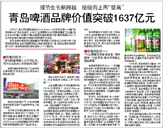 6月26日,由世界品牌实验室(World Brand Lab)主办的(第十六届)“世界品牌大会”在北京举行,大会以“全球领导力与中国品牌重建”为主题,发布了2019年(第十六届)《中国500最具价值品牌》排行榜。青岛啤酒以1637.72亿元的品牌价值连续16年蝉联中国啤酒行业首位。