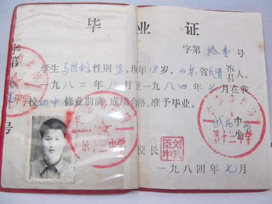 这本上世纪八十年代初的毕业证书特别小,似乎是“袖珍版”的,外观是红色塑料皮,折叠起来比一张名片大不了多少,毕业时间是1984年7月。证书上共加盖了“两个半”公章,照片和落款处各盖了一个红色公章,齐缝线处则盖了半个红色公章。红色公章是木质篆刻的,在校长签名处还加盖了初中老校长的个人私章,而且毕业证上的内容都是老校长亲笔填写的。毕业证书的落款处是“武庄中学”,而所盖公章的全称则是“山东省长清第十三中学”。