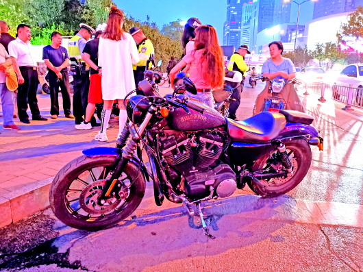 近日晚间,在泺源大街,这辆摩托车的驾驶人及乘坐人都没有戴安全头盔而被交警查处。