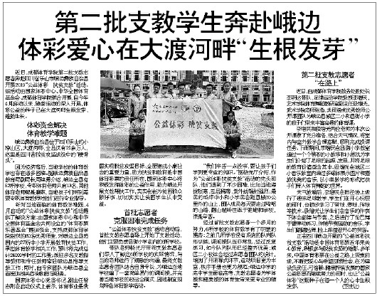 近日,成都体育学院第二批支教志愿者奔赴四川省乐山市峨边彝族自治县开展2019“公益体彩 扶贫支教”活动。该活动由国家体彩中心、中华全国体育基金会、成都体育学院联合开展,自今年4月启动以来,随着活动的深入开展,体彩公益的种子已在大渡河畔生根发芽、蓬勃生长。