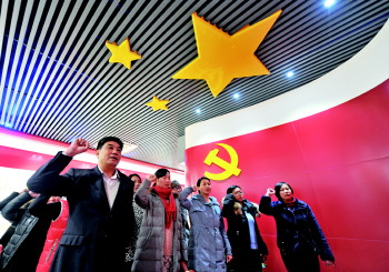 仙营街道党性教育基地内,党员干部重温入党誓词。
