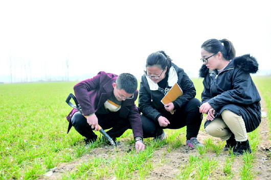 春管时节,在德州平原“90后”硕士农场主何石宝(左一)许幸(左二)查看小麦墒情。