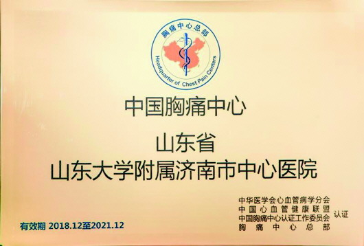 2018年12月,通过中国胸痛中心认证,成为济南区域内第一家国家级胸痛中心,所有胸痛患者均实现“先抢救、后付费”,“有胸痛到医院,有胸痛到中心医院”已经成为无数济南市民心中普遍的共识。