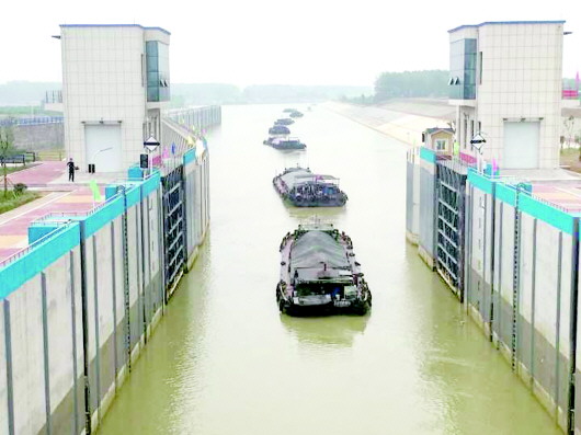 本报枣庄6月28日讯(记者 米娜) 6月28日,枣庄台儿庄区涧头集镇的京杭运河万年闸复线船闸迎来试通航,该复线船闸的通航将有效缓解京杭运河枣庄段船闸通过能力不足的现状。