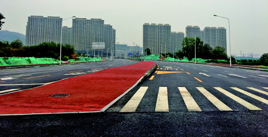 6月28日上午,记者来到港九路与次六路交叉口附近看到,港九路上车来车往,东西走向的次六路已经完工,该路为双向四车道,两侧还有专门的慢行车道和人行道。